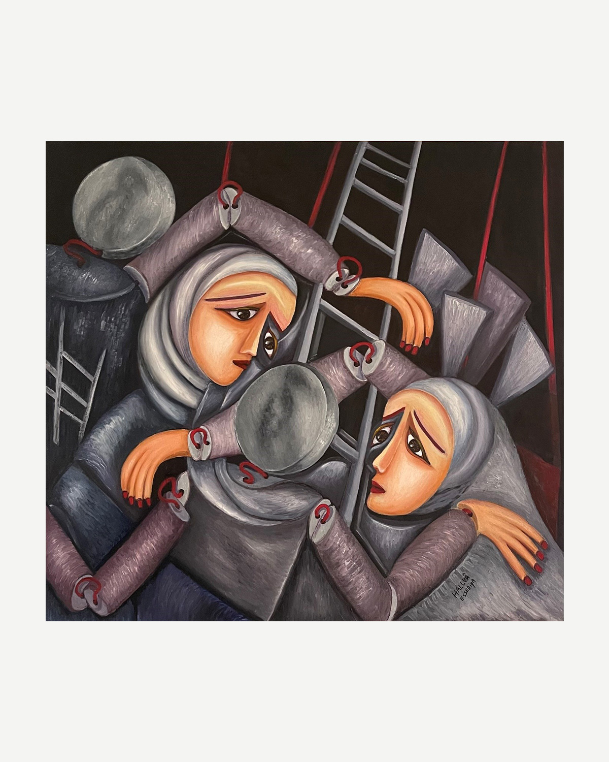 This painting expresses my deep sense of disillusionment. Who is pulling the strings? Who is really in control? The figures in this piece appear like lifeless puppets, dragged into a destructive system they do not understand and cannot escape.